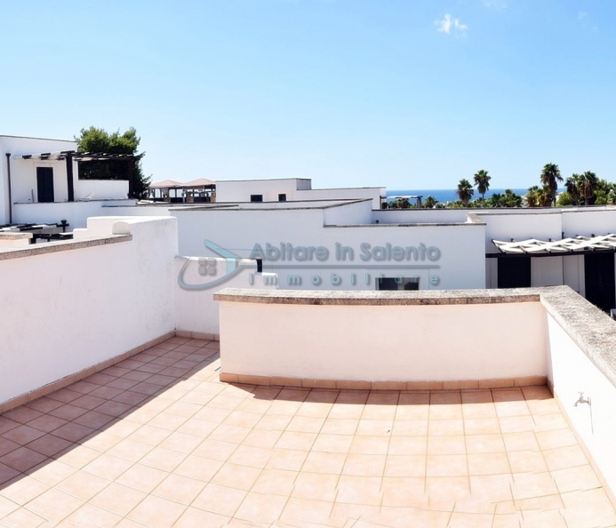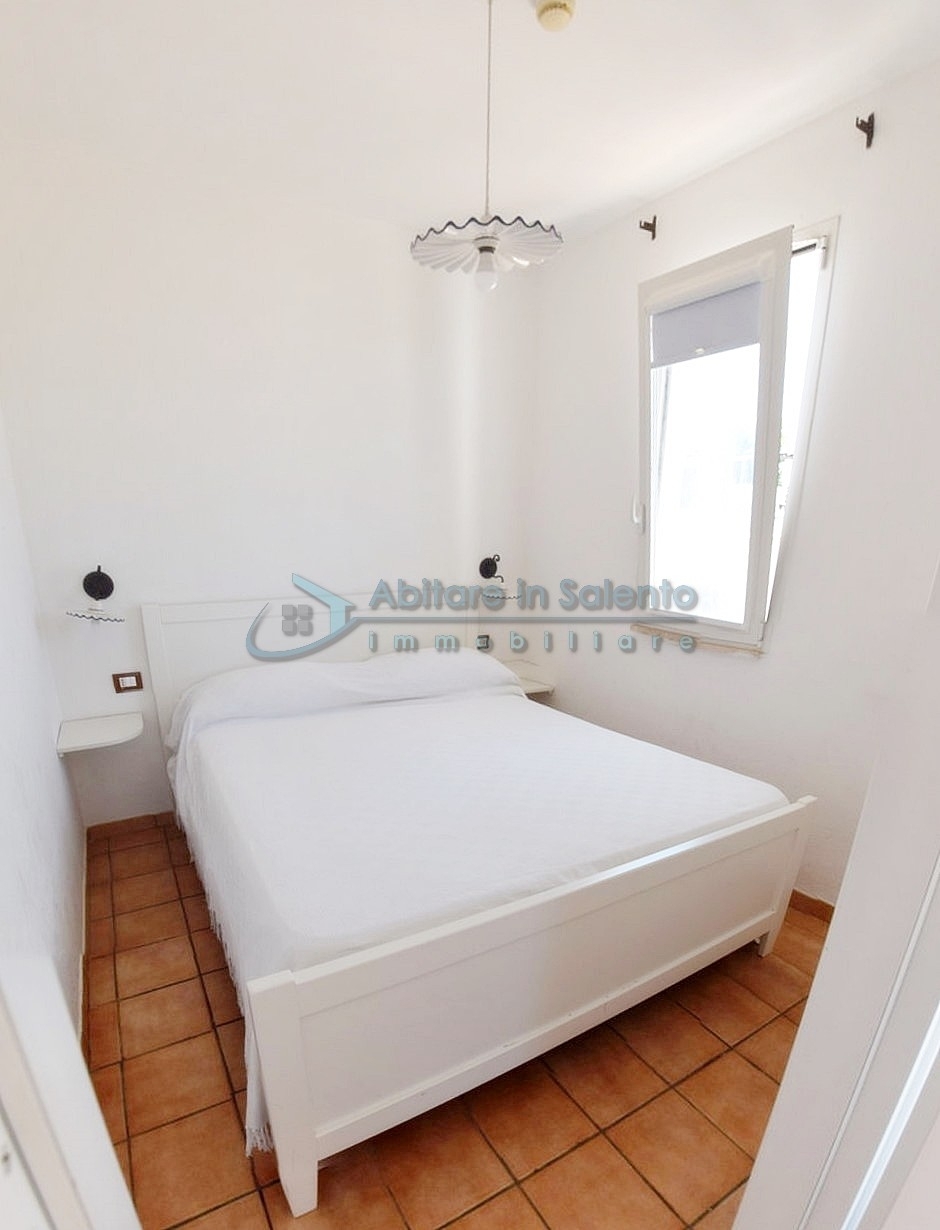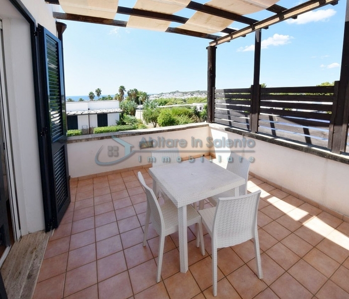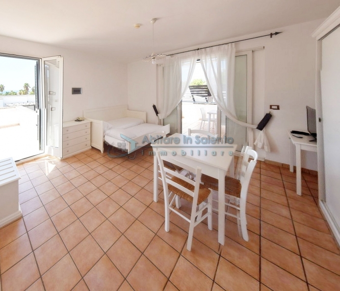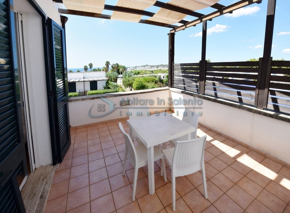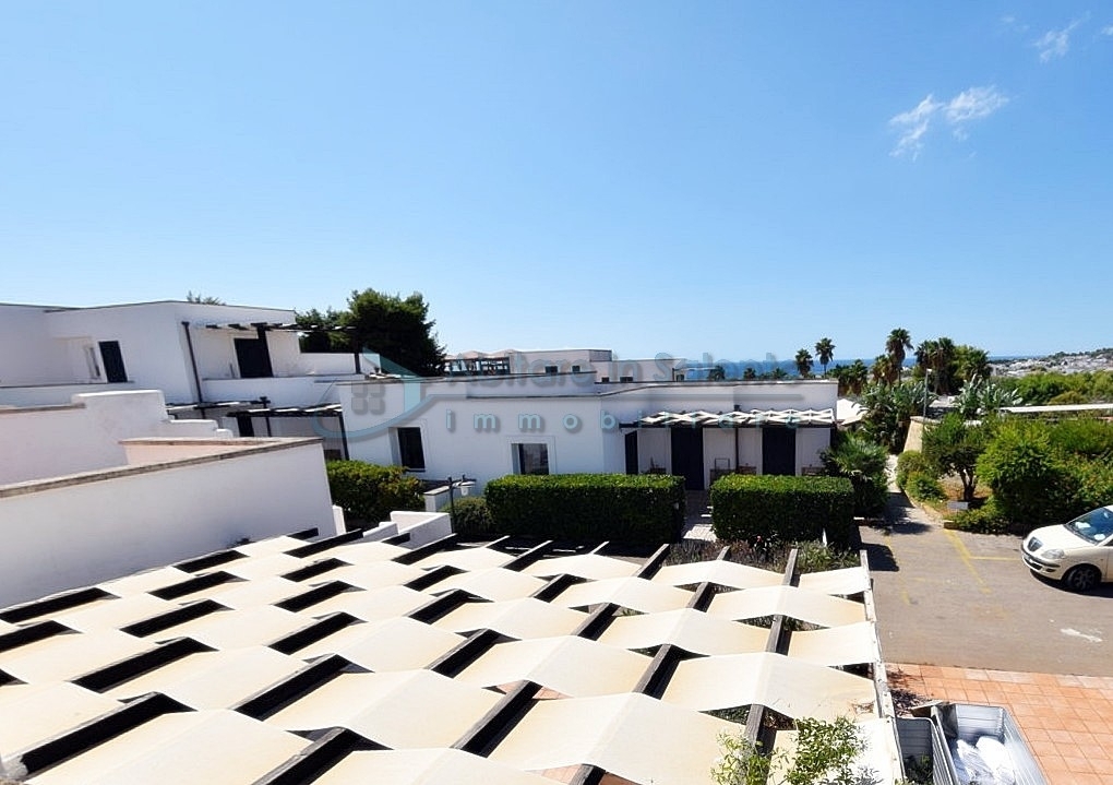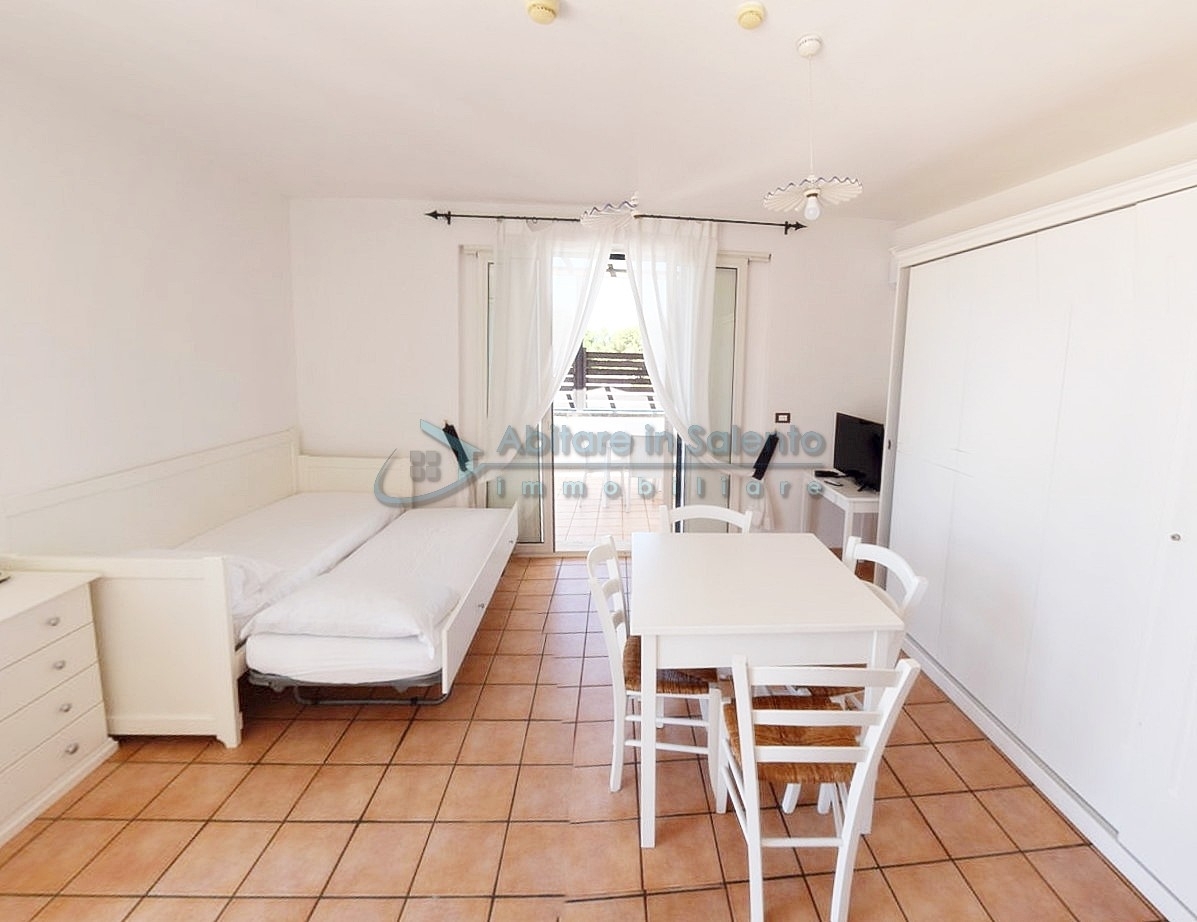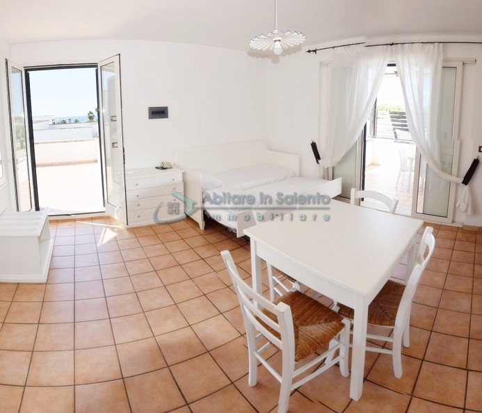 MARINA DI LEUCA - Nell'incantevole cornice di Santa Maria di Leuca, la perla del Salento, all'interno di un complesso alberghiero a 4 stelle con piscina d'acqua salata, centro benessere e ristoranti, strategicamente posizionato per offrire una vista mozzafiato sul mare a poche centinaia di metri dalla costa, proponiamo in vendita un accogliente bilocale ben arredato, dotato di tutti i comfort moderni (aria condizionata, zanzariere, ecc.), con arredamento recente, in regime di multiproprietà, con una superficie di circa 50 metri quadrati. Questa unità si trova al primo piano con ingresso indipendente da una scala esterna e si compone di un ampio terrazzo frontale con vista mare, una luminosa sala con angolo cottura e divano letto, TV e tavolo da pranzo, una camera da letto, un bagno e un accesso a una graziosa terrazza laterale anch'essa con vista mare e dotata di un patio coperto con tendoline, un tavolino e poltrone in rattan. Prezzo riferito alla 27ª settimana dell'anno solare (prima settimana di Luglio). Ottimo investimento!