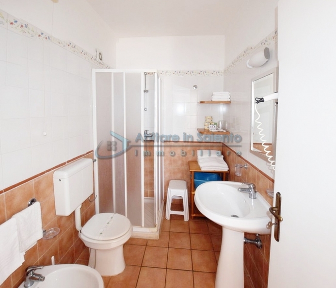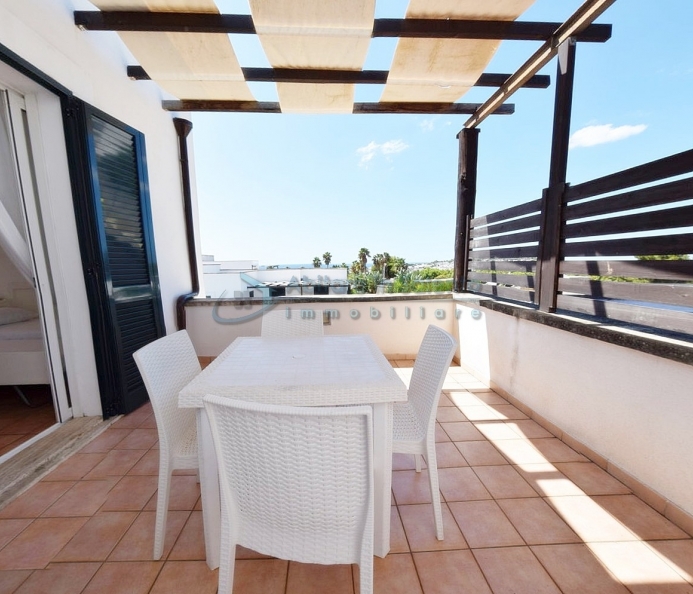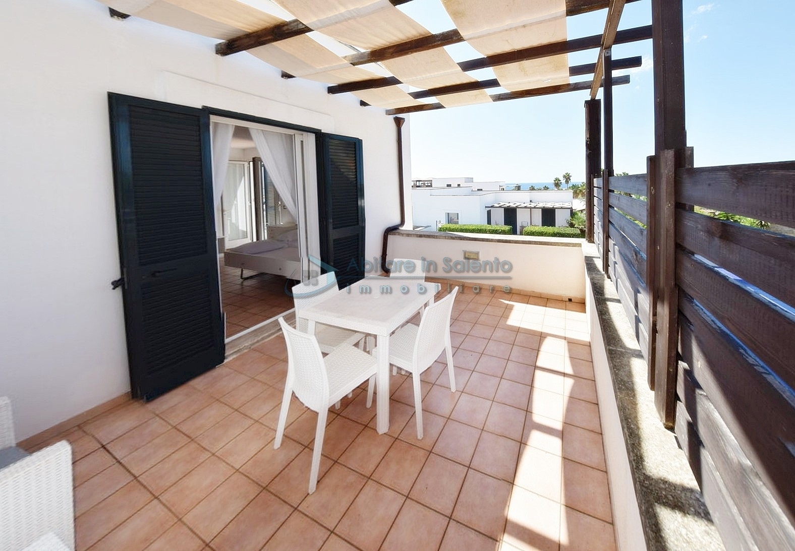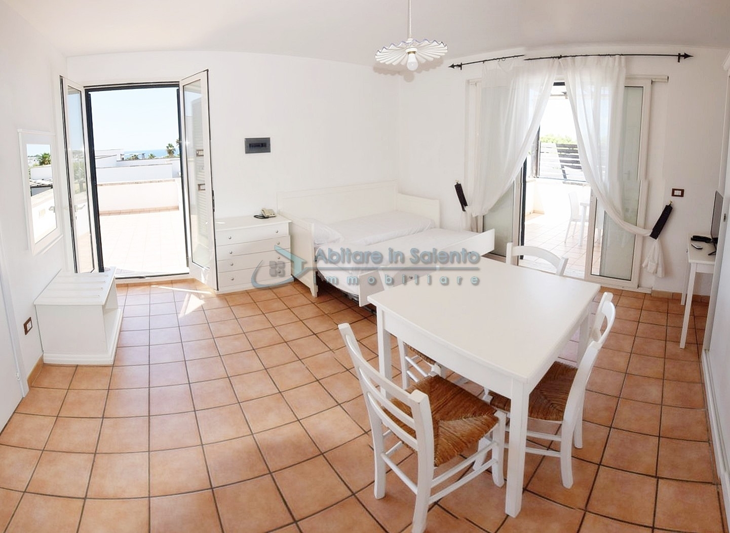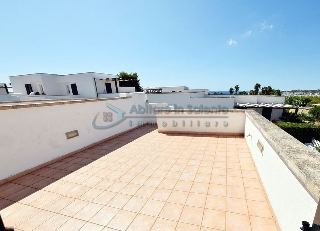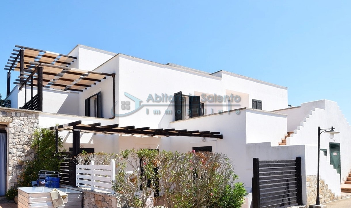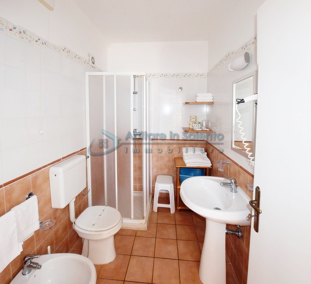 MARINA DI LEUCA - Nell'incantevole cornice di Santa Maria di Leuca, la perla del Salento, all'interno di un complesso alberghiero a 4 stelle con piscina d'acqua salata, centro benessere e ristoranti, strategicamente posizionato per offrire una vista mozzafiato sul mare a poche centinaia di metri dalla costa, proponiamo in vendita un accogliente bilocale ben arredato, dotato di tutti i comfort moderni (aria condizionata, zanzariere, ecc.), con arredamento recente, in regime di multiproprietà, con una superficie di circa 50 metri quadrati. Questa unità si trova al primo piano con ingresso indipendente da una scala esterna e si compone di un ampio terrazzo frontale con vista mare, una luminosa sala con angolo cottura e divano letto, TV e tavolo da pranzo, una camera da letto, un bagno e un accesso a una graziosa terrazza laterale anch'essa con vista mare e dotata di un patio coperto con tendoline, un tavolino e poltrone in rattan. Prezzo riferito alla 27ª settimana dell'anno solare (prima settimana di Luglio). Ottimo investimento!